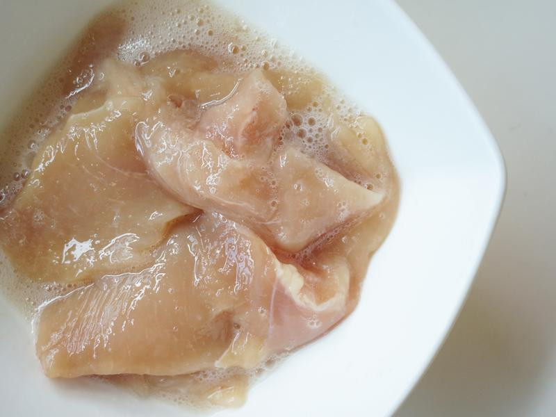 6.雞胸肉片成約1.5公分厚度的片狀,將醃漬料通通倒入并充分抓拌均勻后靜置15分鐘。